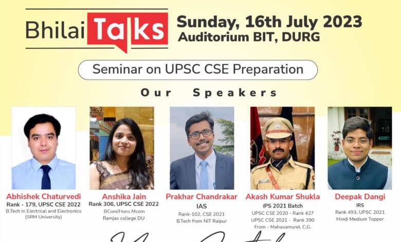 दुर्ग/ यूपीएससी एवं प्रशासनिक सेवा की तैयारी करने वालों के लिए बड़ी खुशखबरी है। जिला प्रशासन एवं नगर निगम भिलाई के संयुक्त तत्वाधान में भिलाई टॉक का आयोजन किया जा रहा है। इसमें यूपीएससी चयनित अनुभवी एवं टॉपर्स प्रशासनिक सेवा की तैयारी कर रहे युवाओं को बेहतर टिप्स देंगेऔर अपने पूरे अनुभवों को साझा करेंगे। 16 जुलाई दिन रविवार को बीआईटी के ऑडिटोरियम में यूपीएससी की तैयारी करने वालो को यूपीएससी चयनित अनुभवी अभिषेक चतुर्वेदी, अंशिका जैन, आईएएस प्रखर चंद्राकर व आईपीएस आकाश कुमार पूरे अनुभवों को स्टूडेंट्स को साझा करेंगे। यही नहीं स्टूडेंट्स इनसे सवाल भी कर सकते है, प्रश्नोत्तरी भी होगी ताकि कोई भी संशय हो उसे दूर किया जा सके। कार्यशाला में भाग लेने के लिए बीआईटी के ऑडिटोरियम में ही 9ः30 बजे से पंजीयन होगा तथा 10ः00 बजे से कार्यशाला प्रारंभ होगी। यूपीएससी की तैयारी करने वाला कोई भी छात्र छात्रा इसमें शामिल हो सकता है। कार्यशाला में पैनल डिस्कशन भी होगा। कार्यशाला में कलेक्टर पुष्पेन्द्र कुमार मीणा एवं पुलिस अधीक्षक शलभ कुमार सिन्हा भी शामिल होंगे। यूपीएससी की तैयारी के लिए एक्सपर्ट अपनी राय भी देंगे और कैसे तैयारी करना है इसके बारे में बताएंगे पढ़ाई की तकनीक एवं टाइम मैनेजमेंट के बारे में भी बताया जाएगा जनरल नॉलेज एवं करंट अफेयर के टिप्स भी दिए जाएंगे। तैयारी के लिए नोट्स किस प्रकार से तैयार किए जाएंगे और रिवीजन कैसे करना है ये भी एक्सपर्ट बताएंगे