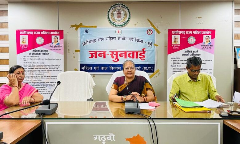 छत्तीसगढ़ राज्य महिला आयोग की अध्यक्ष डॉ. किरणमयी नायक ने आज जिला पंचायत सभा कक्ष में महिला उत्पीड़न से संबंधित प्रकरणों पर जनसुनवाई की
