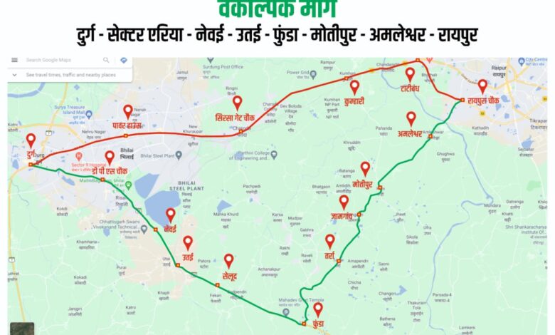 भिलाई ,दुर्ग से रायपुर जाने वाले दो पहिया ,चार पहिया वाहन चालक उतई – फुन्डा – मोतीपुर – अमलेश्वर मार्ग का प्रयोग करे।