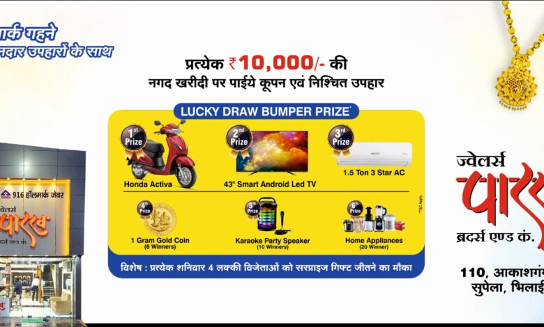 विगत कई वर्षों से स्थापित ज्वेलर्स पारख ब्रदर्स एंड कंपनी 110 आकाशगंगा में ग्राहकों के लिए नई स्कीम लॉन्च की गई है जिसमें ग्राहकों को 10000 की नगद खरीदी पर एक कूपन दिया जाएगा इसमें उपहार के रूप में टीवी फ्रिज एसी जैसे अन्य कई प्रकार के उपहार उसमें उपलब्ध रहेंगे