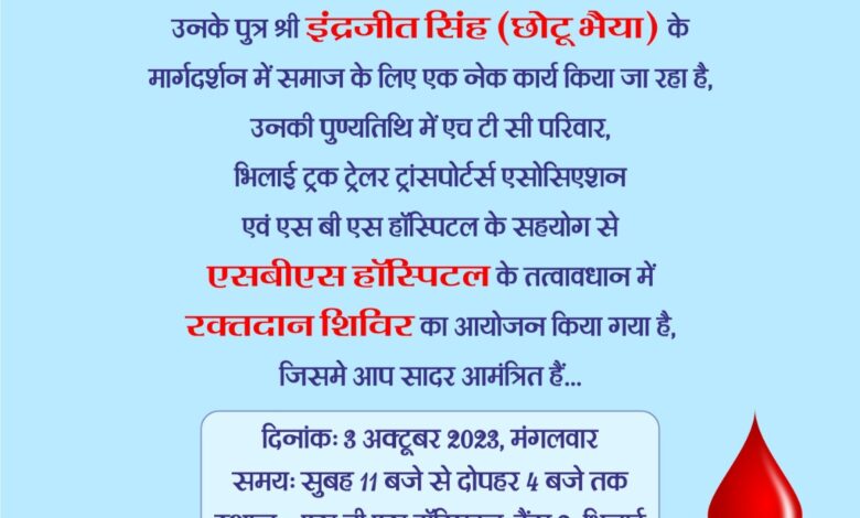 भिलाई नगर में 2 अक्टूबर 2023 सेठ बीरा सिंह की चौथी पुण्यतिथि के अवसर पर 3 अक्टूबर को हैवी ट्रांसपोर्ट कंपनी द्वारा पहले से ही चिन्हित किए गए 10 जरूरतमंदों को इलेक्ट्रिकल ट्राई साइकिल का वितरण किया जाएगा