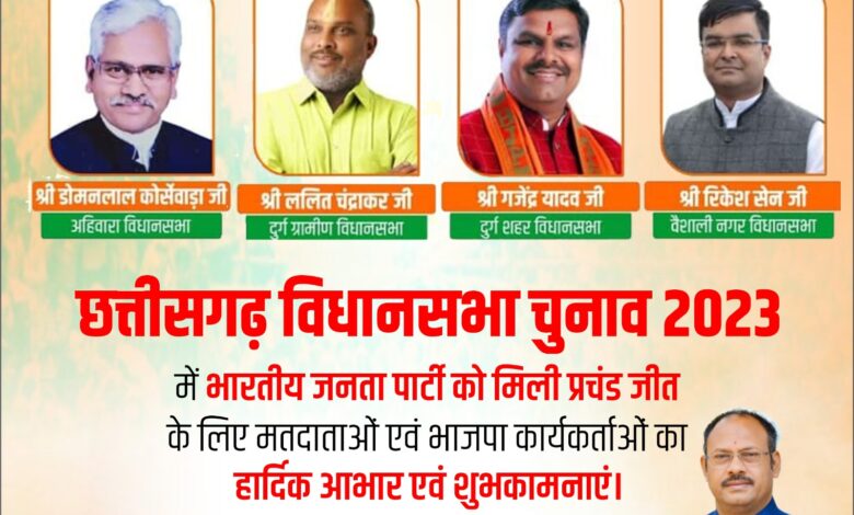 जिला भाजपा संगठन द्वारा दुर्ग जिले के नवनिर्वाचित भाजपा विधायकों का अभिनंदन जिला भाजपा अध्यक्ष जितेंद्र वर्मा के नेतृत्व में किया जाएगा