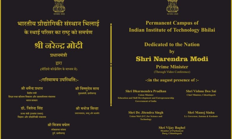 दुर्ग/भिलाई प्रधानमंत्री श्री नरेन्द्र मोदी भिलाई के आईआईटी का करेंगे शुभारंभ माननीय मुख्यमंत्री श्री विष्णुदेव साय होंगे कार्यक्रम में शामिल प्रधानमंत्री श्री नरेन्द्र मोदी के द्वारा भिलाई में आईआईटी का करेंगे शुभारंभ वीडियो कॉन्फ्रेसिंग के माध्यम से 20 फरवरी 2024 को 11.00 बजे उद्घाटन किया जायेग। माननीय छत्तीसगढ़ के मुख्यमंत्री श्री विष्णुदेव साय होंगे कार्यक्रम में शामिल। जिसमें केन्द्रीय मंत्री श्री धर्मेंन्द्र प्रधान, राज्य मंत्री(स्वतंत्र प्रभार) डॉ. जितेन्द्र सिंह, उपराज्यपाल, जम्मू और कश्मीर श्री मनोज सिन्हा एवं लोकसभा सांसद दुर्ग श्री विजय बघेल की गरिमामय उपस्थिति में होगा