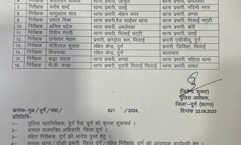 पुलिस अधीक्षक जितेंद्र शुक्ला ने शनिवार को जिले के 16 निरीक्षको का तबादला आदेश जारी किया है। जारी आदेश में दुर्ग कोतवाली, मोहन नगर, जामुल, पुरानी भिलाई, भिलाई भट्टी, महिला थाना, धमधा, बोरी, उतई, पद्मनाभपुर, अमलेश्वर और नंदिनी नगर के थाना प्रभारी बदल दिए हैं