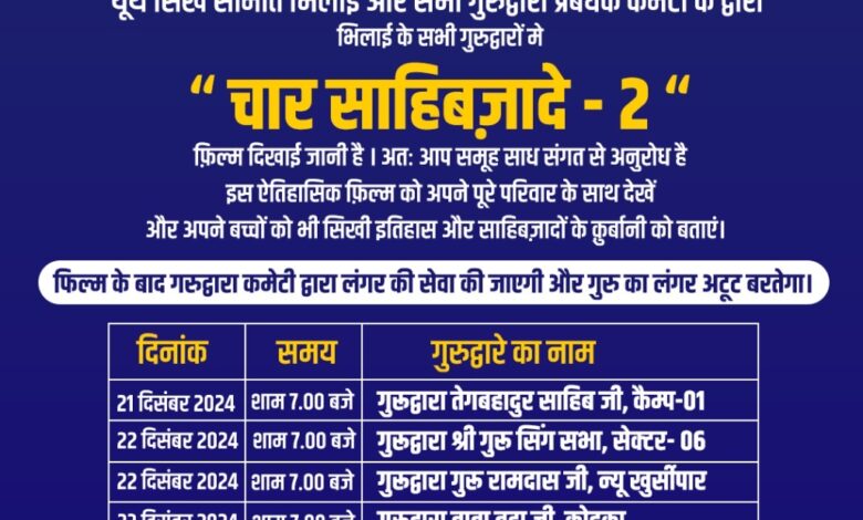 आराध्या टाइम्स डेस्क/चार साहिबज़ादे और माता गुजरी जी की शहादत को नमन करते हुए यूथ सिख समिति भिलाई और सभी गुरुद्वारा प्रबंधक कमेटी के द्वारा दिनांक 21 दिसंबर 2024 से 30 दिसंबर 2024 तक अलग-अलग दिन भिलाई के सभी गुरुद्वारों मे “ चार साहिबज़ादे – 2 “फ़िल्म दिखाई जानी है । अतः आप समूह साध संगत से अनुरोध है इस ऐतिहासिक फ़िल्म को अपने पूरे परिवार के साथ देखें और अपने बच्चों को भी सिखी इतिहास और साहिबज़ादों के क़ुर्बानी को बताएं।