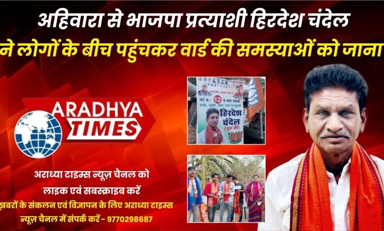 आराध्या टाइम्स डेस्क /भारतीय जनता पार्टी के प्रत्याशी हिरदेश चंदेल कर रहे प्रचार प्रसार लोगों के बीच पहुंचकर वार्ड की समस्याओं को जाना लोगों के बीच पहुंचकर वार्ड की समस्याओं को जाना जीत के आने पर मूलभूत सुविधाओं पर करेंगे कार्य अहिवारा में नगरीय निकाय चुनाव के लिए प्रचार प्रसार शुरू हो गया है इसी कड़ी में भारतीय जनता पार्टी के प्रत्याशी हिरदेश चंदेल वार्ड क्रमांक 12 से पार्षद के प्रत्याशी है हिर्देश चंदेल लोगों के बीच पहुंचकर चुनाव प्रचार कर रहे है और लोगों से अपने लिए वोट की अपील कर रहे है साथ ही वार्ड वासियों से उनकी समस्या के बारे में चर्चा कर रहे है एवं जीत के आने के बाद वार्ड वासियों के समस्या का समाधान करने का संकल्प कर रहे है
