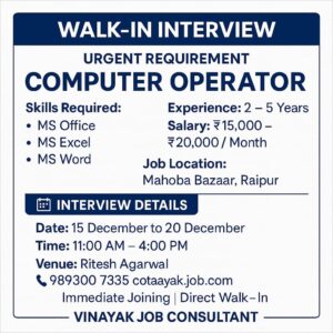 रायपुर /आराध्या टाइम डेस्क विनायक जॉब कंसलटेंट में निकली बम्पर नौकरी के अवसर